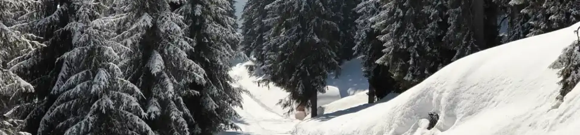 Tranquil Snowy Forest Trail Lined With Trees in Ellmau, Austria – A Picturesque Winter Escape. Photo by Rinke Dohmen, Unsplash.